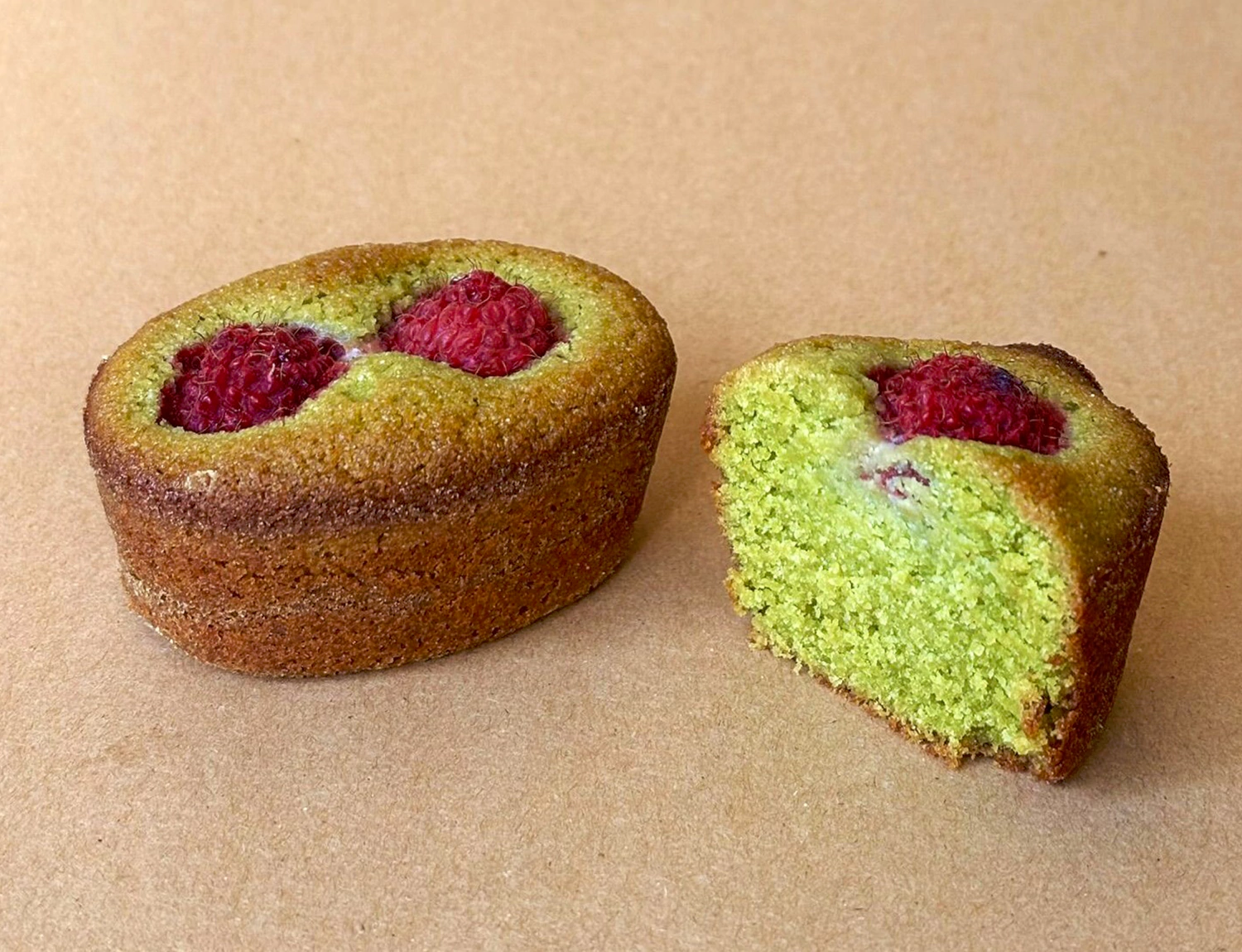 Ingredients: Egg whites, Almond Flour, Rice Flour, Brown Butter, Corn Starch, Icing Sugar, Matcha powder, Vanilla extract, Salt, Fresh Raspberries.