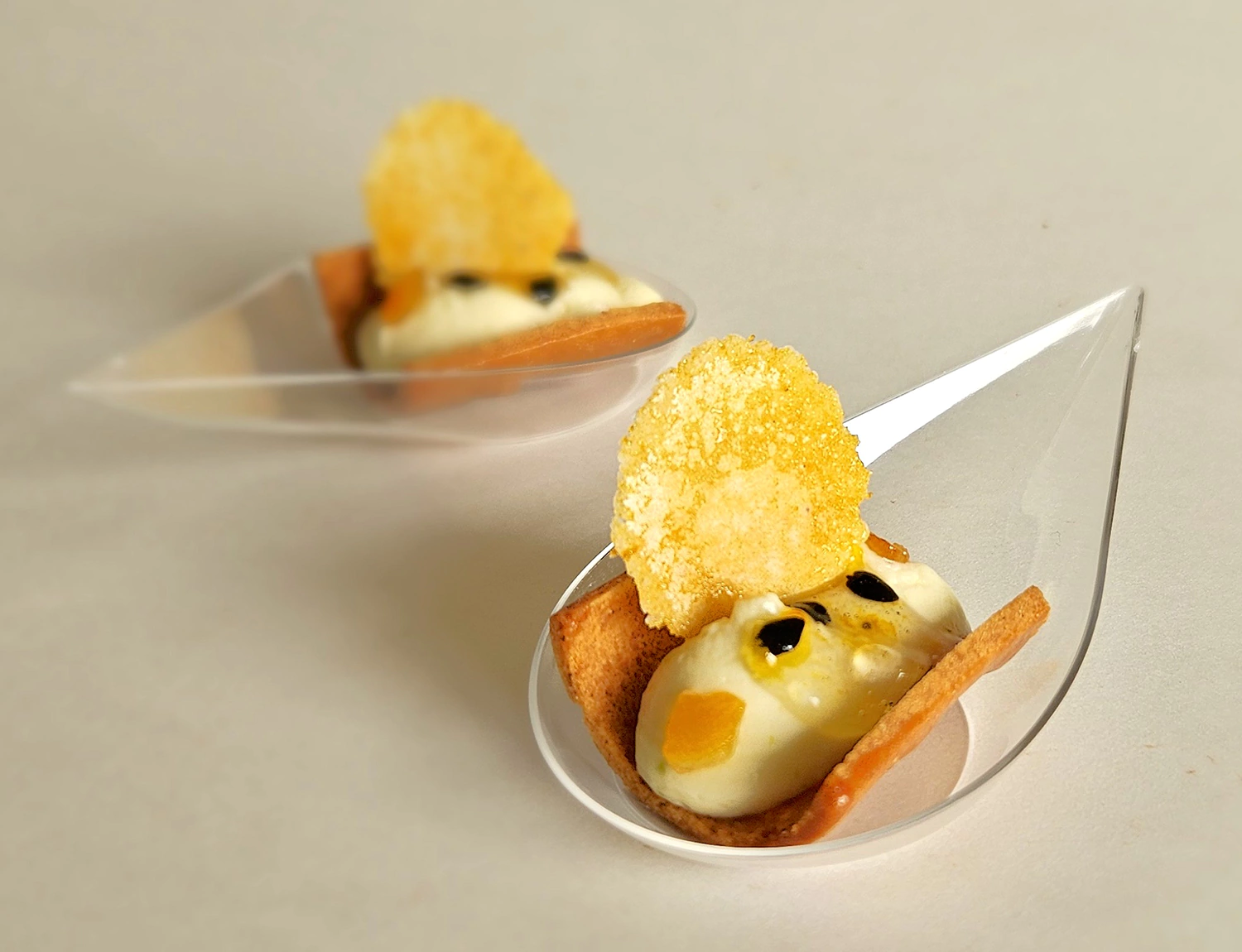 A bite size delicate almond shortcrust holds a luscious lemon white chocolate namelaka, crowned with passionfruit coulis, syrup, a sprinkle of pistachio streusel, and adorned with vibrant candied citrus. Passion Jewel offers a harmonious balance of bright citrus, exotic passionfruit, and subtle crunch, a handcrafted, jewel-like dessert that delights both the eye and the palate.