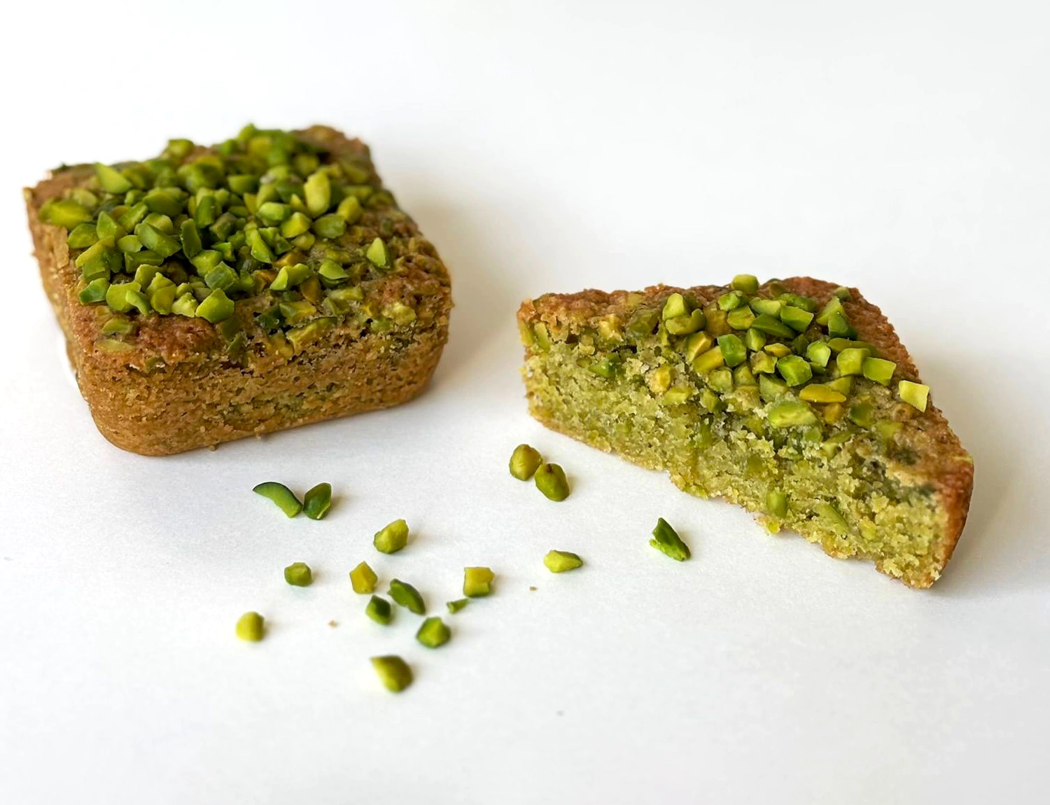 Ingredients: Egg Whites, Pistachio Flour, Rice Flour, Cornstarch, Brown Butter, Icing Sugar, Chopped Pistachio, Cardamom, Salt.