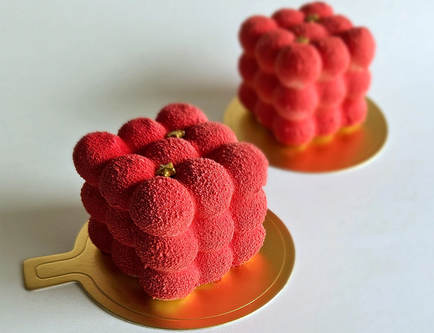 A refined creation uniting vanilla white chocolate ganache and strawberry compote with pistachio sponge and pistachio streusel. Finished in a radiant red velvet glaze, it embodies perfect harmony of flavour, texture, and elegance.