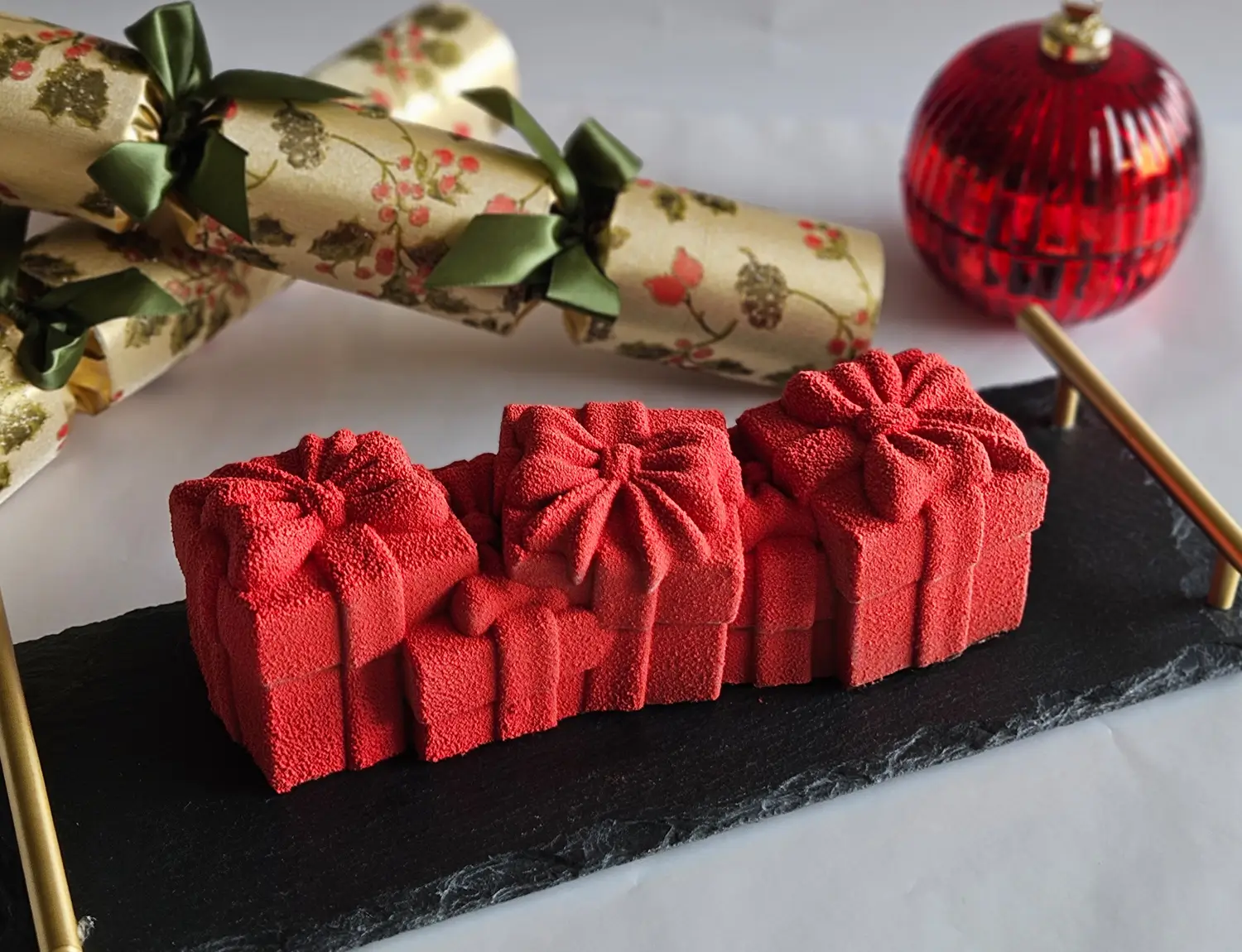 A refined dark chocolate mousse entremet layered with a vibrant cherry compote insert, resting on a crisp hazelnut crunch, crushed feuilletine and soft almond sponge. Finished in a red velvet glaze, this dessert is rich, balanced, and elegantly indulgent, a striking centrepiece designed to be shared. (Size: 250 x 85 x 85 mm, Serves: 8-10 people)